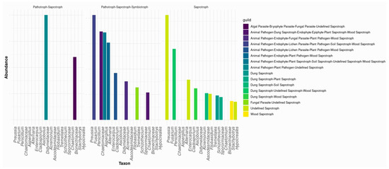 FUNGuild functional prediction (Top 20 taxa shown) revealed that most fungi exhibited mixed trophic modes, primarily pathotroph-saprotroph or pathotroph-saprotroph-symbiotroph, indicating potential roles as decomposers, pathogens, and symbionts. At the near-shrub (0 m), multitrophic taxa were most prevalent, including Pleiochaeta, Xenodidymella, Aureobasidium, and Cladosporium (pathotroph–saprotroph [±symbiotroph] assignments), consistent with a resource-rich microhabitat favoring ecological generalists. Typical fast-growing saprotrophs such as Chaetomium and Penicillium were also enriched under the canopy, reflecting litter/OM inputs and rapid turnover. By contrast, at 3–6 m, we observed higher relative representation of oligotrophy-tolerant taxa such as Alfaria and Myriococcum, consistent with lower nutrient availability away from shrubs. Across land-use types, the cultivated field was enriched in Cystofilobasidiaceae (yeast-like taxa often classified as saprotrophs or mixed modes), whereas Stephanosporaceae, Myriococcum, and Alfaria were relatively more abundant in the fallow field (Figure 6).