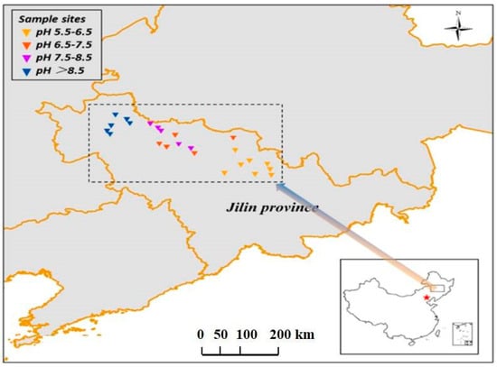 - Wang, Y.; Zhang, X.Y.; Gao, Q.; Li, C.L.; Yan, L.; Feng, G.Z. Temporal and spatial variability of soil pH in cropland of Jilin Province. J. Soil Sci. 2017, 48, 387–391. (In Chinese) [Google Scholar]