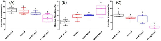 Relative abundances of Proteobacteria (A), Actinobacteria (B), and Acidobacteria (C) in soils with different pH ranges. Bars labeled with different letters are significantly different (p < 0.05).