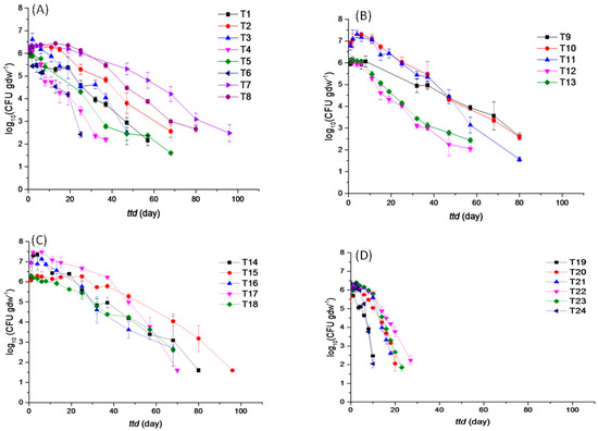 Survival curves of E. coli O157 in weak acidic soils (T1–T8) (A), neutral soils (T9–T13) (B), weak basic soils (T14–T18) (C), and strong basic soils (T19–T24) (D).
