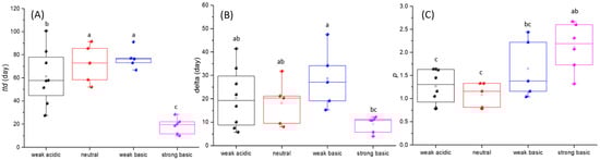 The ttd of weak basic soils was the longest, followed by neutral, weak acidic, and strong basic soils. Correspondingly, the δ value of the neutral group was the largest, followed by neutral, weak acidic, and strong basic soils. As for p, there was no significant difference (p < 0.05) among weak acidic soils, neutral soils, and weak basic soils.