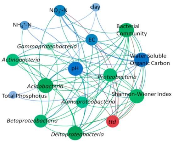 Co-occurrence network analysis was used to provide a visual depiction of the factors affecting ttd, including abiotic factors such as various soil physicochemical properties (pH, WSOC, EC, NO3−-N, NH4+-N, clay, TP) and biotic factors such as the structure of the bacterial community, relative abundances of Proteobacteria, Acidobacteria, Actinobacteria, α-Proteobacteria, β-Proteobacteria, γ-Proteobacteria, and δ-Proteobacteria (Figure 5). In Figure 5, red dots represent ttd, blue dots indicate soil physicochemical properties affecting EcO157 survival, and green dots represent biological factors. The larger the circle and the darker the color, the more significant the effect of the factors on ttd. The key topological parameters of the co-occurrence network are presented in Table S5. The major influencing factors included pH, WSOC, NO3−-N, bacterial community, H, Proteobacteria, and Acidobacteria. The influencing factors obtained from CCA completely overlap with the results of the co-occurrence network analysis (Figure S5).