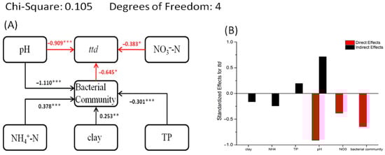 Structural equation models (SEMs) based on direct and indirect effect of soil properties and bacterial community structures on the survival parameters ttd (A) of E. coli O157:H7. The direct and indirect effects of environmental factors on ttd are quantified (B). ***, **, and * indicate that p values are significant at 0.001, 0.01, and 0.05 levels, respectively. The red arrow indicates a direct impact on the survival parameter ttd. NH4+-N, ammonium nitrogen; NO3−-N, nitrate nitrogen; TP, total phosphorus; bacterial community, the first axis scores from non-metric multidimensional scaling; pH, potential of hydrogen.