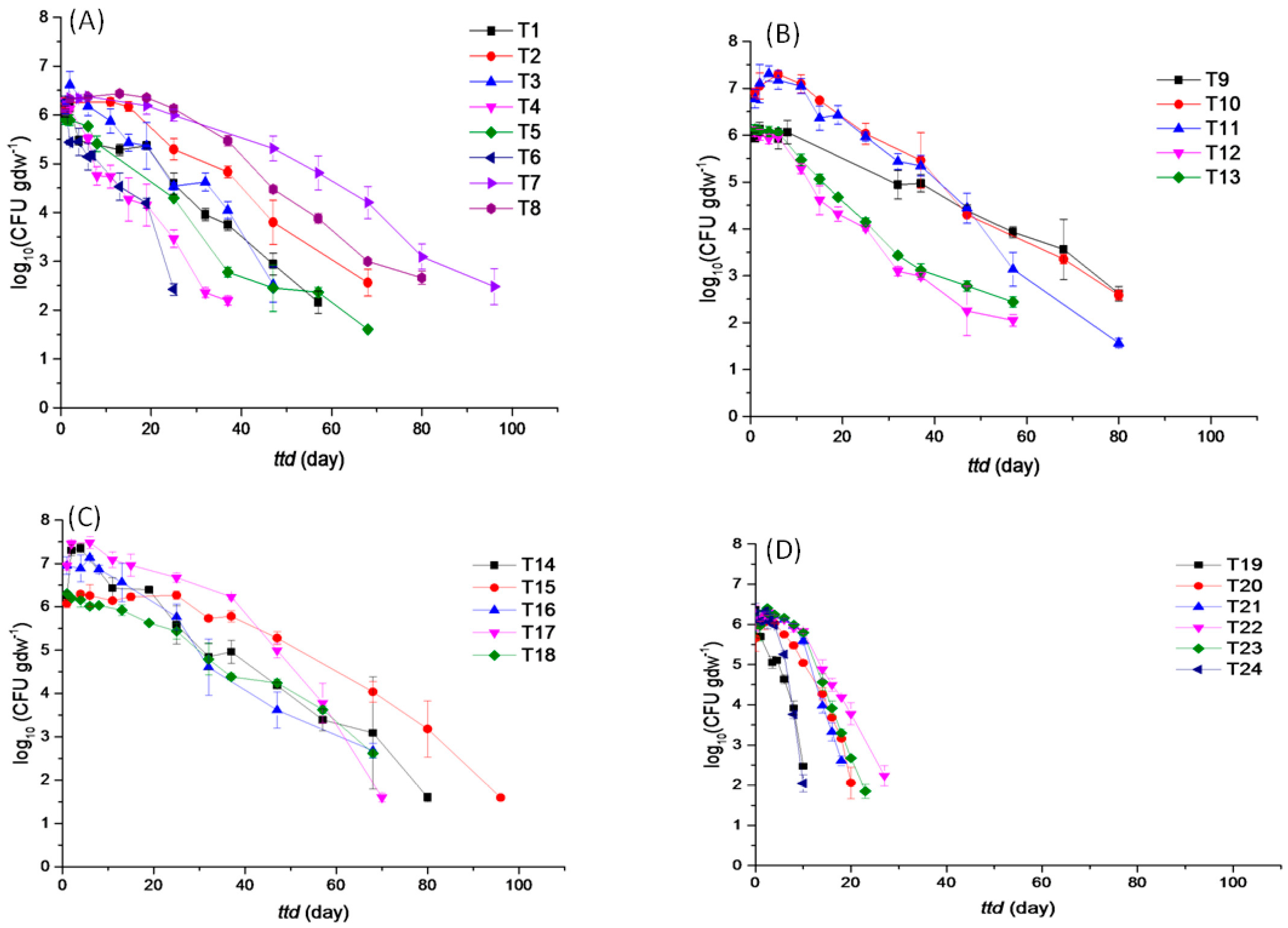 3.3. Survival Behavior of E. coli O157:H7 in Soils