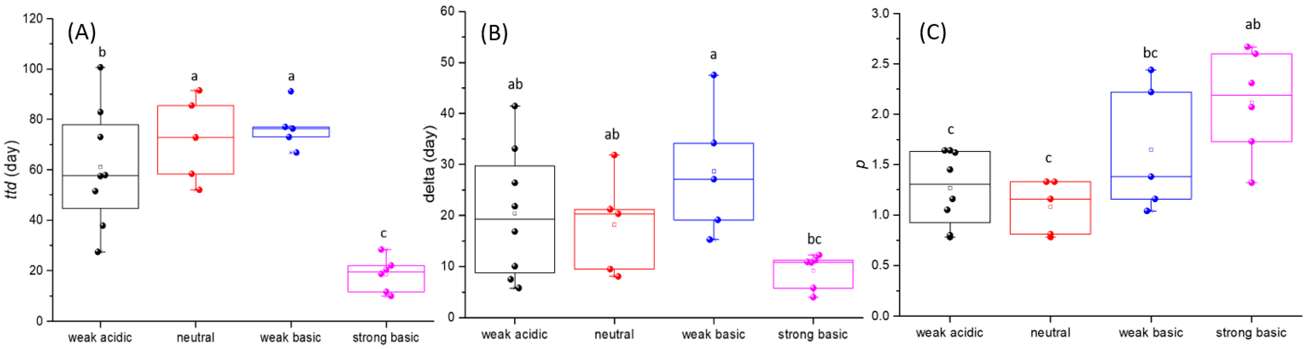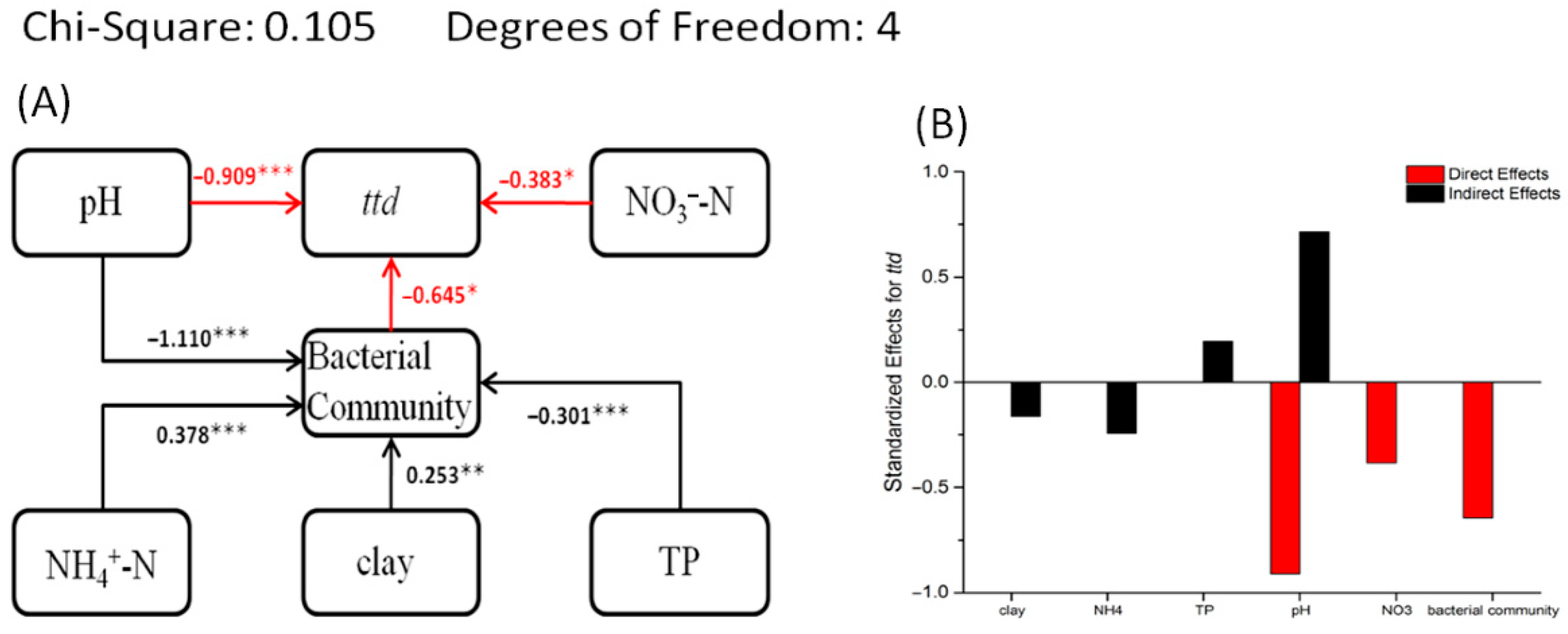 | ttd = −177.079 − 2.845 × pH − 3.912 × NO3−-N + 25.409 × Proteobacteria − 111.826 × Acidobacteria + 28.432 × H | 0.861 | 8.155 | 0.000 | pH NO3−-N Proteobacteria Acidobacteria H | −0.152 −0.274 0.074 −0.396 +0.825 | −0.430 ** −1.629 ** −0.335 ** −1.136 ** +3.748 ** |