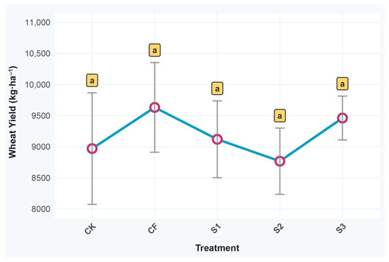 For the S1 treatment, a tendency toward increased winter wheat yield was observed, yet its yield-promoting effect was less pronounced than that of the S3 treatment. Notably, the S2 treatment led to a reduction in winter wheat yield.