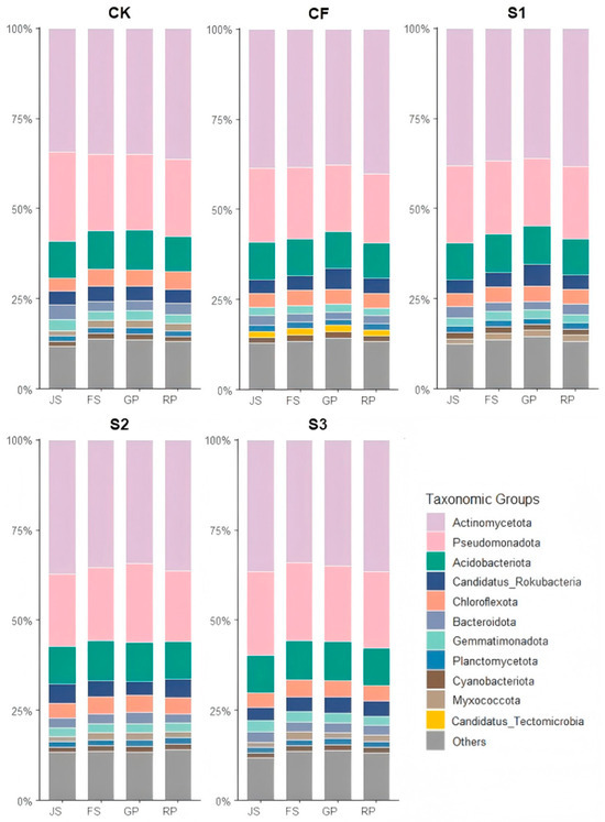Actinomycetota maintained notable stability in the CK treatment (34.30–36.36%), consistently showing the lowest relative abundance among treatments at each sampling stage. Statistically significant differences in Actinomycetota abundance were observed between CK and CF at each growth stage (p < 0.05), with CF exhibiting a 4% higher abundance than CK. In the S1 and S3 treatments, Actinomycetota abundance displayed a ‘V-shaped’ pattern, declining initially and then rebounding during the RP, with abundance at the JS and RP stages consistently exceeding intermediate stages by two percentage points. The abundance dynamics of Actinomycetota in S1 closely mirrored those in CF, particularly during the FS and GP. In S2, Actinomycetota abundance showed a unimodal pattern, peaking at 37.16% during JS.