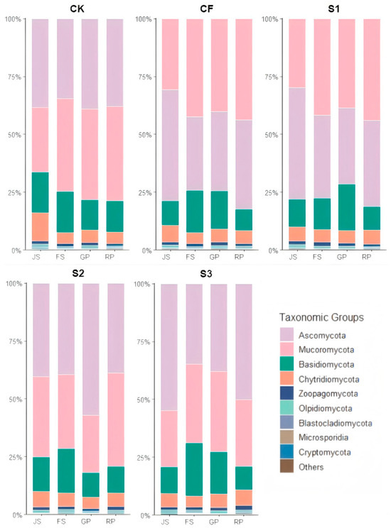 The abundance of Mucoromycota in CK showed a slight decline during FS but generally increased over time (Figure 3). CF followed a similar trend but exhibited higher abundance at each period compared to CK, indicating that chemical fertilizers stimulate Mucoromycota proliferation. For biogas slurry top-dressed at JS (S1 and S3), abundances were lower than CK during JS. Similarly, for biogas slurry top-dressed at GP (S2 and S3), abundances were lower than CK during GP. This indicates that biogas slurry can restrict increases in Mucoromycota abundance. Notably, after additional chemical fertilizer application during GP in S1, Mucoromycota abundance exceeded that in CK.