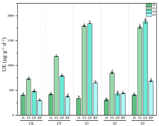 Figure 5. Changes in UE activity across different treatments during various periods. UE: urease; JS: jointing stage; FS: flowering stage; GP: grain-filling period; RP: reaping period. CK: Topdressing with water at both JS and GP, CF: Topdressing with chemical fertilizer at both JS and GP, S1: Topdressing with biogas slurry at JS, followed by topdressing with chemical fertilizer at GP, S2: Topdressing with chemical fertilizer at JS, followed by topdressing with biogas slurry at GP, S3: Topdressing with biogas slurry at both JS and GP. The letters a, b, c, etc. in the picture represent the differences among various treatments within the same period.