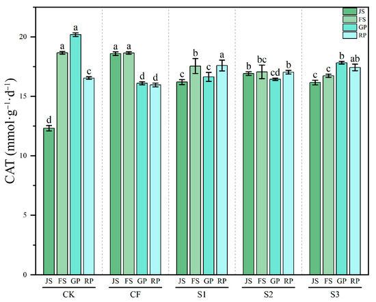 Figure 7. Changes in CAT activity across different treatments during various periods. CAT: catalase; JS: jointing stage; FS: flowering stage; GP: grain-filling period; RP: reaping period. CK: Topdressing with water at both JS and GP, CF: Topdressing with chemical fertilizer at both JS and GP, S1: Topdressing with biogas slurry at JS, followed by topdressing with chemical fertilizer at GP, S2: Topdressing with chemical fertilizer at JS, followed by topdressing with biogas slurry at GP, S3: Topdressing with biogas slurry at both JS and GP. The letters a, b, c, etc. in the picture represent the differences among various treatments within the same period.