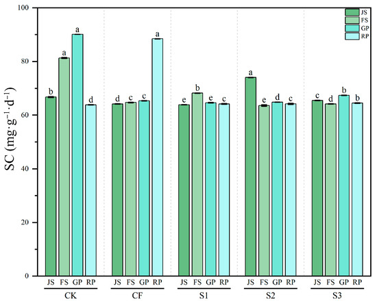 Figure 8. Changes in SC activity across different treatments during various periods. SC: sucrase; JS: jointing stage; FS: flowering stage; GP: grain-filling period; RP: reaping period. CK: Topdressing with water at both JS and GP, CF: Topdressing with chemical fertilizer at both JS and GP, S1: Topdressing with biogas slurry at JS, followed by topdressing with chemical fertilizer at GP, S2: Topdressing with chemical fertilizer at JS, followed by topdressing with biogas slurry at GP, S3: Topdressing with biogas slurry at both JS and GP. The letters a, b, c, etc. in the picture represent the differences among various treatments within the same period.