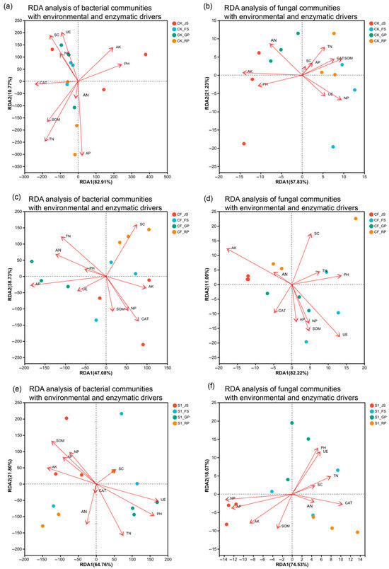 Redundancy Analysis (RDA) was used to analyze the variation in soil microbial communities constrained by environmental factors and enzyme activities across different treatments (Figure 9). The first two axes of all RDA models cumulatively explained 79.06% to 95.82% of the variation in microbial communities, indicating that these constrained models effectively captured the primary relationships between environmental factors and community structure.