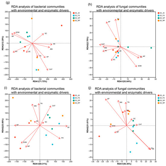Figure 9. Redundancy Analysis (RDA) of Bacterial and Fungal Communities with Environmental and Enzymatic Drivers. SOM: soil organic matter; TN: total nitrogen; AP: available phosphorus; AK: available potassium; AN: ammonium nitrogen; UE: urease; NP: neutral phosphatase; CAT: catalase; SC: sucrase; JS: jointing stage; FS: flowering stage; GP: grain-filling period; RP: reaping period. CK: Topdressing with water at both JS and GP, CF: Topdressing with chemical fertilizer at both JS and GP, S1: Topdressing with biogas slurry at JS, followed by topdressing with chemical fertilizer at GP, S2: Topdressing with chemical fertilizer at JS, followed by topdressing with biogas slurry at GP, S3: Topdressing with biogas slurry at both JS and GP. Letters (aj) label the individual subfigures in sequential order.