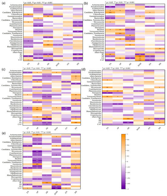 In CK treatment (a), Planctomycetota exhibited a highly significant, strong positive correlation with SC activity (r = 0.502, p = 0.003). Acidobacteriota also showed a significant moderately strong positive correlation with SC activity (r = 0.211, p = 0.04), whereas no significant correlation was observed between SC activity and fungi. NP and UE activities did not show significant correlations with bacteria. NP activity displayed significant moderately strong correlations with the fungal phyla Ascomycota (r = 0.415) and Olpidiomycota (r = 0.346, p < 0.05). Similarly, UE activity was significantly and moderately correlated with Ascomycota (r = 0.246) and Zoopagomycota (r = 0.289, p < 0.05). In contrast, CAT activity demonstrated positive correlations with most bacterial groups, showing highly significant strong positive correlations with Pseudomonadota, Candidatus_Rokubacteria, Chloroflexota, Candidatus_Tectomicrobia, Planctomycetota, Myxococcota, and Verrucomicrobiota (r ≥ 0.4, p < 0.01). The fungal phylum Mucoromycota (r = 0.646) also showed a highly significant strong positive correlation with CAT activity (p < 0.01).