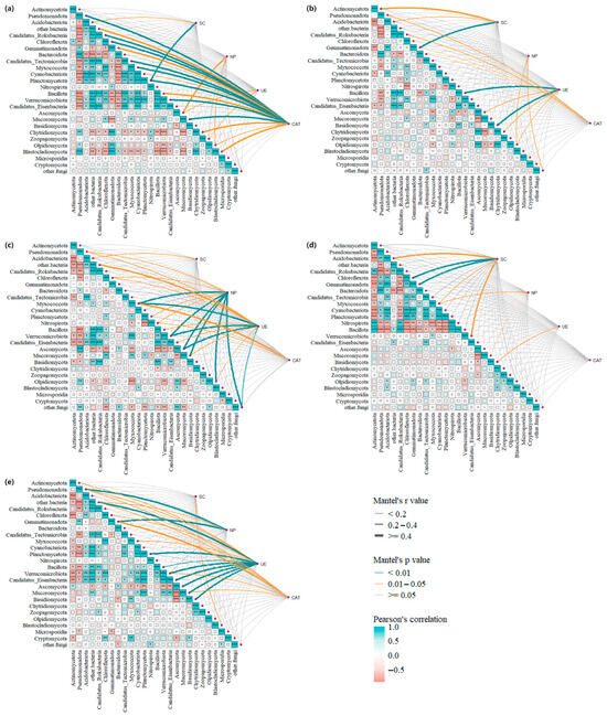Figure 11. Pearson correlation and partial Mantel test analysis showed the relationship between microbial communities and enzymes. (ae) represent CK, CF, S1, S2, and S3, respectively. UE: urease; NP: neutral phosphatase; CAT: catalase; SC: sucrase; * represents significant at p < 0.05; ** represents significant at p < 0.01; *** represents significant at p < 0.001.