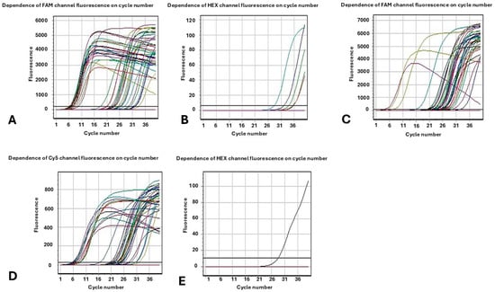 Fluorescence as a function of cycle number. The results of the Multiplex Real-Time PCR molecular method for the (A) KPC enzymes (channel FAM); (B) OXA-48 similar enzymes (channel HEX); (C) VIM enzymes (channel FAM); (D) NDM enzymes (channel CY5); (E) IMP enzymes (channel HEX).