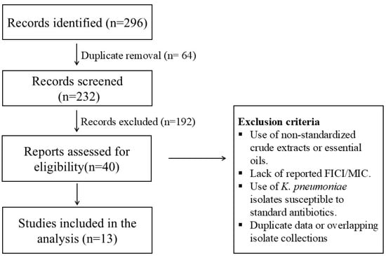 A PRISMA 2020 flow diagram was constructed to illustrate the study selection process. The initial database search identified a total of 296 records. After the removal of duplicates, 232 unique records were screened based on title and abstract. Of these, 40 full-text articles were assessed for eligibility according to predefined inclusion and exclusion criteria, resulting in a final set of 13 studies included in the pooled analysis (Figure 1). Our dataset comprises a total of 270 in vitro synergy tests evaluating the interaction between 18 unique combinations of conventional antibiotics and natural phenolic compounds [60].