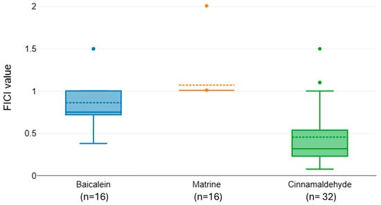 Cefotaxime + baicalein and cefotaxime + cinnamaldehyde demonstrated moderate dispersion (IQR 0.28 and 0.314, respectively), with FICI values spanning both synergistic and indifferent interaction ranges. In contrast, the stability of cefotaxime + matrine suggests a reproducible interaction type with minimal fluctuation.