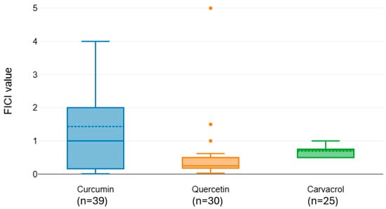 Interestingly, within the same antibiotic class, the efficacy of natural compounds varied considerably. For example, meropenem combined with quercetin demonstrated moderate synergy, while its pairing with curcumin yielded a higher median FICI.