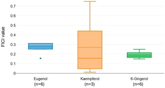 The FICI distributions for colistin in combination with eugenol, kaempferol, and 6-Gingerol indicate overall strong synergistic interactions, with median values below 0.5 for all compounds (Figure 4). Post hoc comparisons revealed no significant differences between pairings. Despite all compounds showing synergistic potential, 6-Gingerol yielded the lowest and most consistent FICI values, highlighting it as the most promising adjunctive agent to colistin among those tested. However, the small sample sizes (n = 3–6) limit the strength of our conclusions.