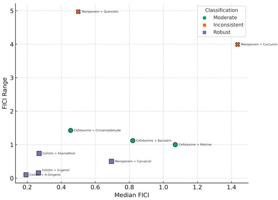 Scatterplot showing the relationship between synergistic potency (median FICI) and variability (FICI range) across 11 antibiotic–phenolic compound combinations tested against multidrug-resistant K. pneumoniae. Each point represents one combination and is color-coded by robustness classification: robust (median FICI ≤ 0.5 and range ≤ 0.5), inconsistent (median FICI ≤ 1.0 and range > 2.0), moderate (other qualifying combinations), and inconclusive (n < 3). Vertical and horizontal dashed lines indicate the 0.5 thresholds used for defining synergy and consistency, respectively.