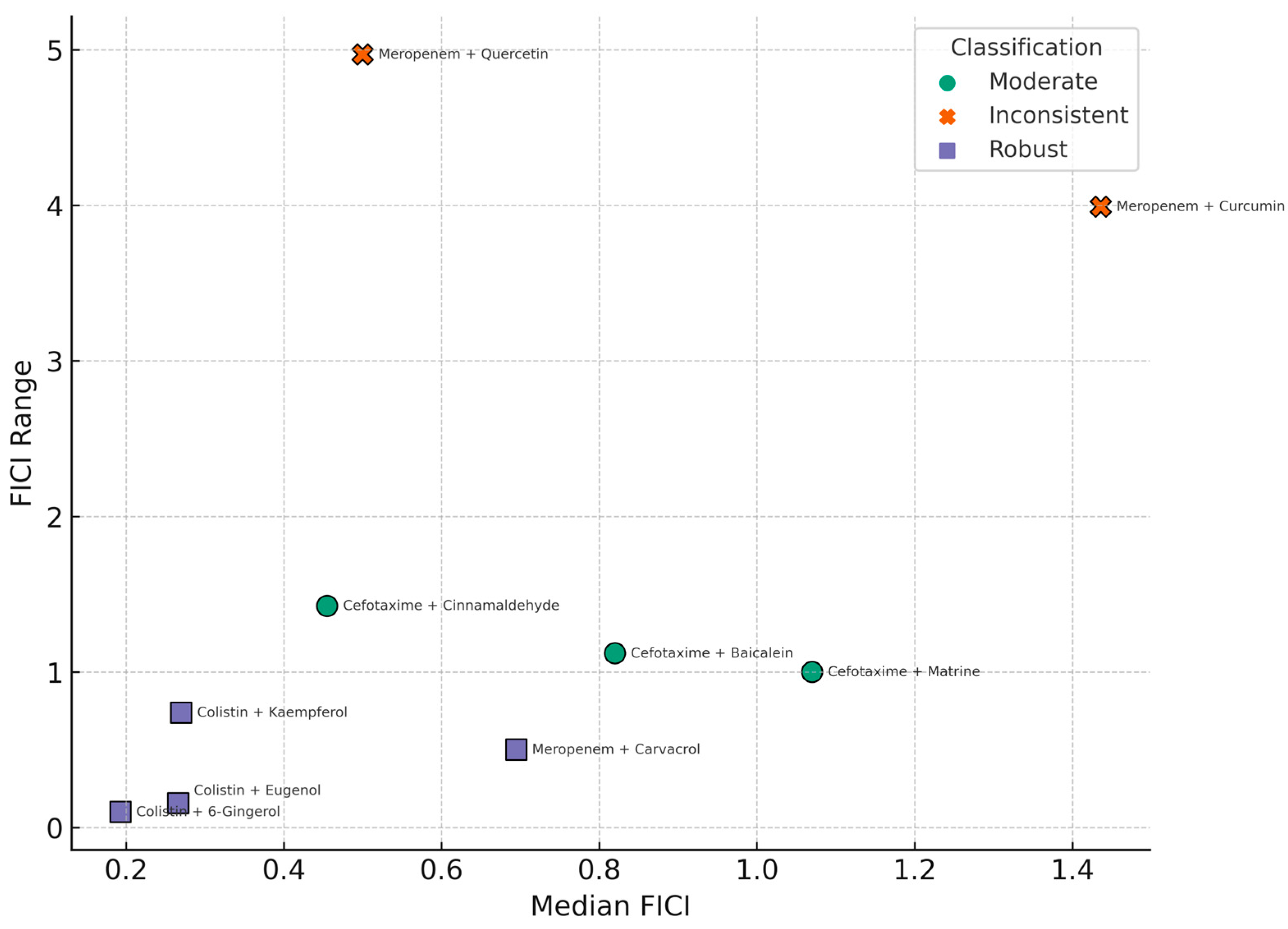 | Antibiotic | Natural Compound | Reference | n | Median FICI (CI 95%) | Min FICI | Max FICI |