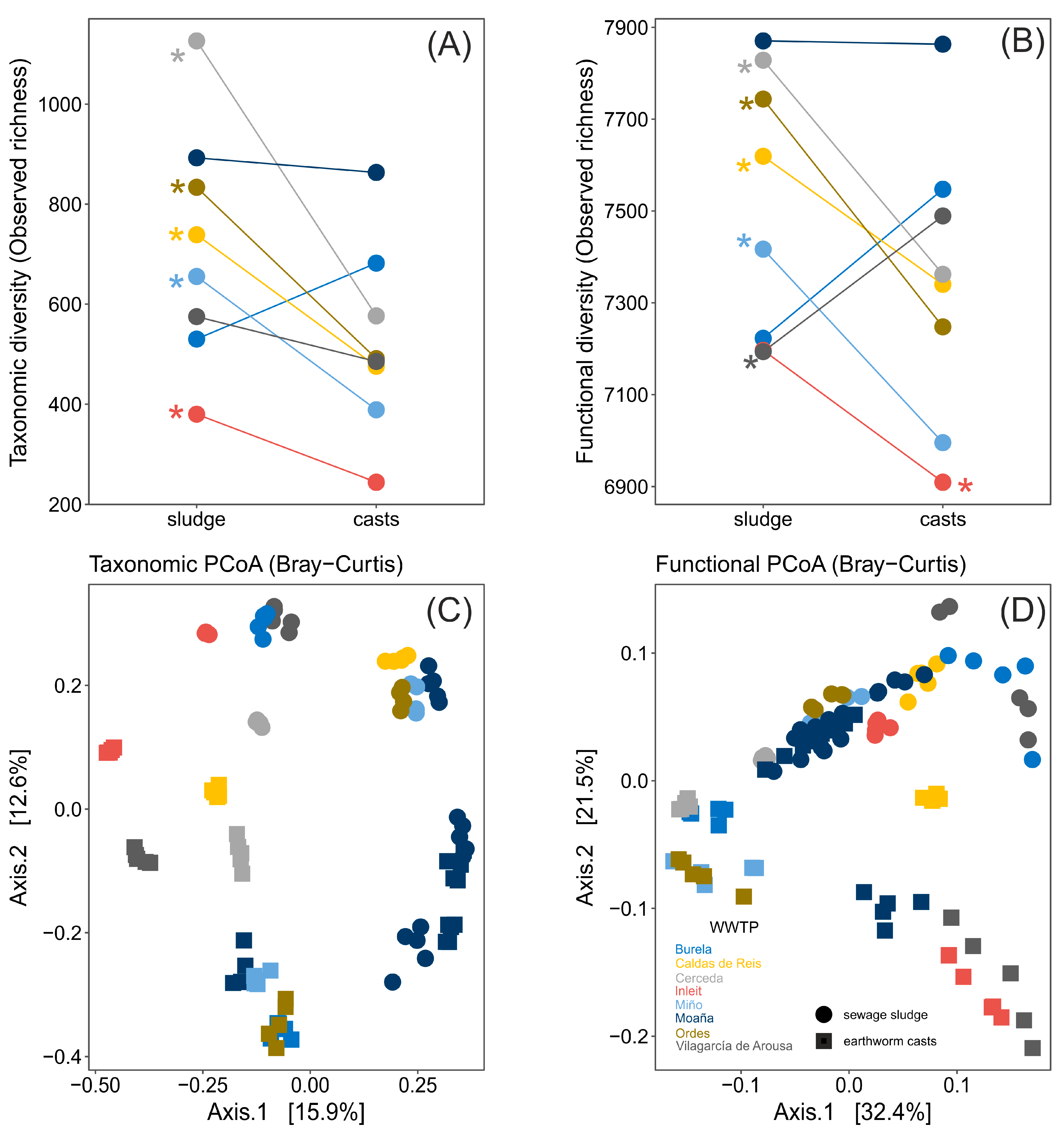 - Domínguez, J.; Aira, M.; Crandall, K.A.; Pérez-Losada, M. Earthworms drastically change fungal and bacterial communities during vermicomposting of sewage sludge. Sci. Rep. 2021, 11, 15556. [Google Scholar] [CrossRef]