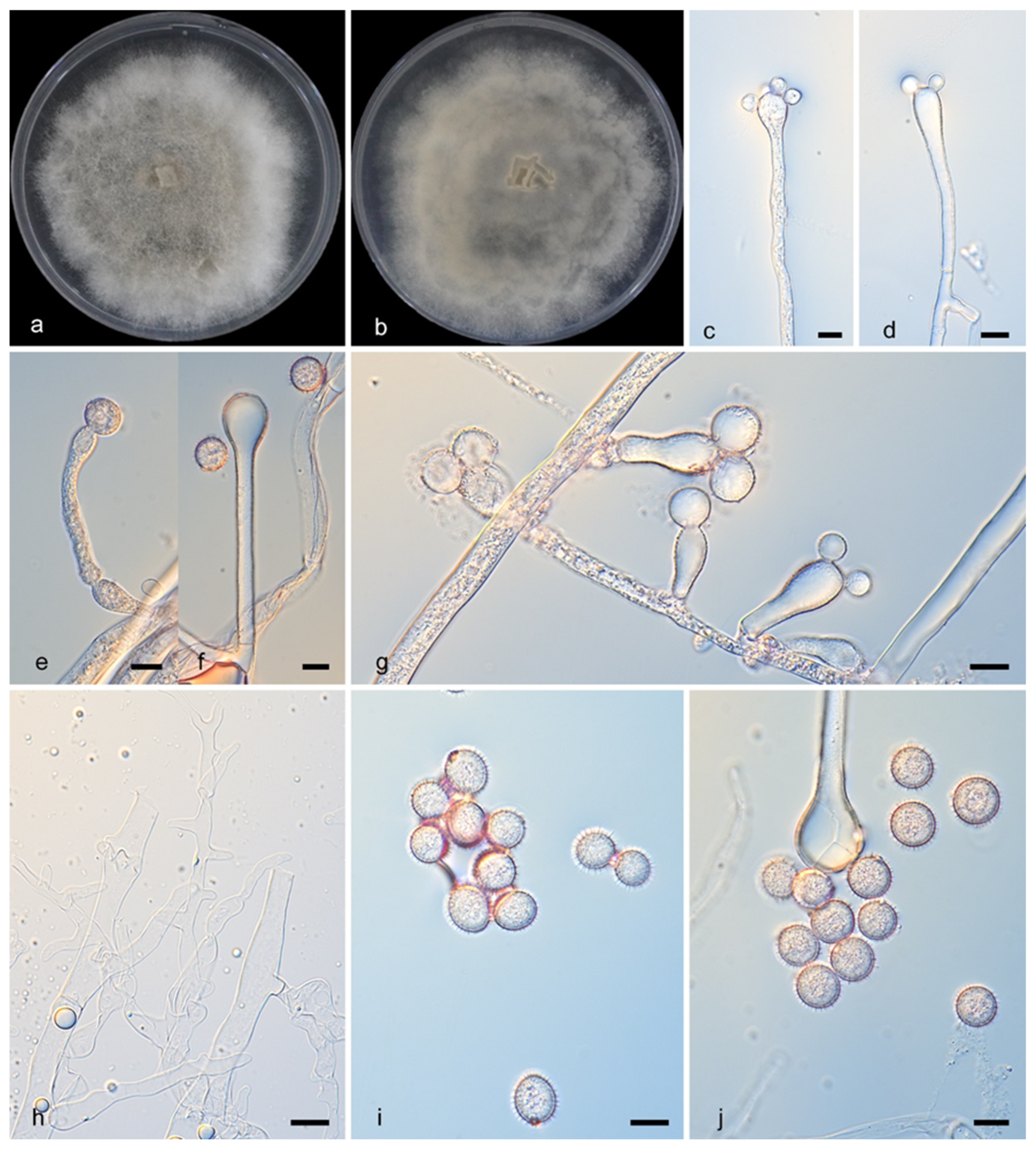 - Wang, Y.J.; Zhao, T.; Wu, W.Y.; Wang, M.; Liu, X.Y. Cunninghamella verrucosa sp. nov. (Mucorales, Mucoromycota) from Guangdong province in China. Phytotaxa 2022, 560, 274–284. [Google Scholar] [CrossRef]