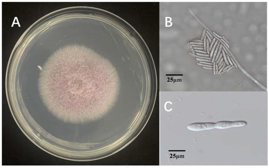 Morphological characteristics of Fusarium ZS97-1. (A): colony morphology on PDA medium; (B): microconidia observed under the microscope; (C): macroconidia observed under the microscope.