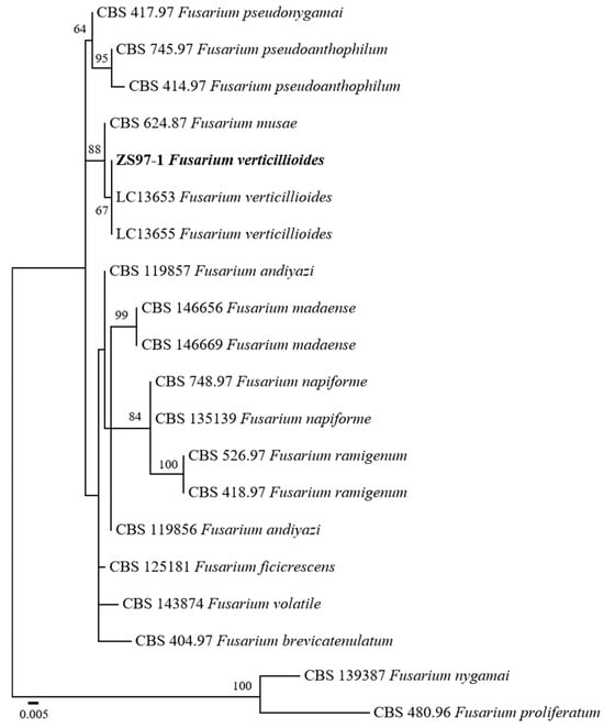 A phylogenetic tree with maximum likelihood (ML) was constructed with 1000 bootstrap replicates. The resulting tree revealed that ZS97-1 clustered within the F. verticillioides clade (Figure 2). Notably, ZS97-1 formed a well-supported monophyletic group with two reference F. verticillioides isolates (LC13653 and LC13655), supported by a bootstrap value of 67%. This phylogenetic relationship strongly supports the molecular identification of ZS97-1 as F. verticillioides.