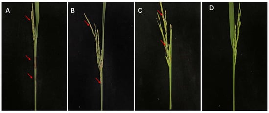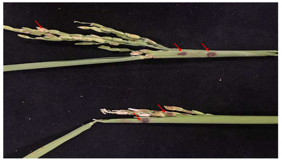 Rice sheath rot is a fungal disease that threatens global rice production. It primarily affects the flag leaf sheaths during critical growth stages, especially around heading, and can cause severe yield losses under favorable environmental conditions. The causal agent is thermophilic and hygrophilic, and its epidemic development is closely related to the ambient temperature and humidity during the reproductive stage of rice growth [1]. Field observations indicate rapid disease progression, with symptoms typically developing into characteristic lesions within 48–72 h after infection. The pathogen colonizes the lower leaf sheaths and subsequently spreads to the panicle through internal translocation during the heading stage. Disease severity depends on rice cultivars; slow-heading varieties are much more susceptible than fast-heading types [2]. The major feature of rice sheath rot is rotting and discoloration of the sheath [3]. Sheath rot infection leads to chaffy, discolored grains and affects the viability and nutritional value of seeds [1,4].