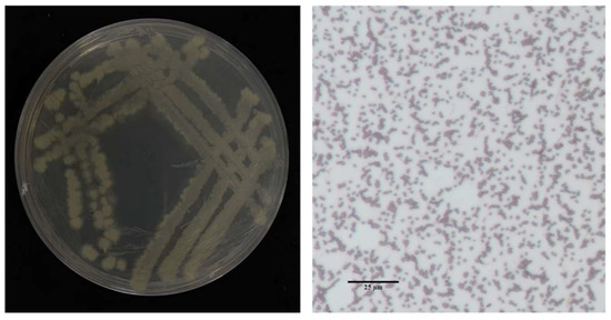Eight bacterial isolates exhibiting inhibitory activity against the rice sheath rot pathogen were isolated from surface-sterilized tissues of healthy rice roots. Among these, isolate 7-A demonstrated significantly stronger antagonistic potential compared to the others and was selected for further characterization (Table 2). In LB medium, isolate 7-A formed milky white, opaque colonies with irregular (possibly serrated) margins on Luria–Bertani agar (LA) plates. Microscopic examination revealed short rod-shaped cells, consistent with typical Bacillus morphology (Figure 4).