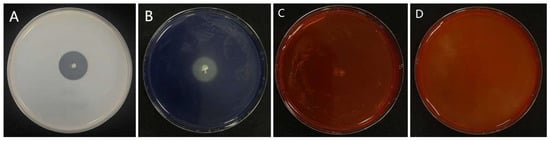 Production of extracellular enzymes by isolate 7-A. The isolate produced (A) protease, (B) siderophores, (C) cellulase, and (D) chitinase.