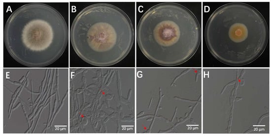 Effects of BCF on the mycelial growth of F. verticillioides at different concentrations: (A) (0%), (B) (1%), (C) (5%), and (D) (10%). Microscopic observation revealed structural abnormalities in the treated hyphae—(F) (1%), (G) (5%), and (H) (10%)—including twisting, swelling, and irregular branching, compared to the control ((E), 0%), which exhibited intact and normal hyphal morphology. The arrow indicates the site of hyphal swelling.