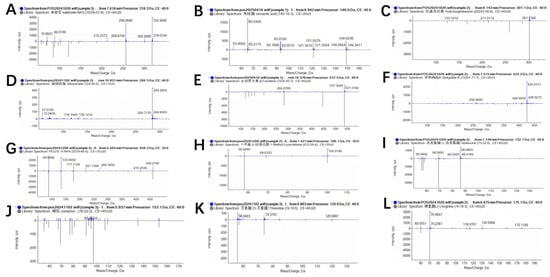 Mass spectrometric analysis was conducted using an electrospray ionization (ESI) source in both positive and negative ion modes. The ion spray voltage was set to 5000 V, and the ion source temperature was maintained at 500 °C. The mass scan range was set to m/z 100–1250. Data acquisition and processing were performed using SCIEX OS software (Version 1.7.0). The identified compounds were tentatively annotated by comparing their mass spectra and retention times with those reported in the literature [46,47].