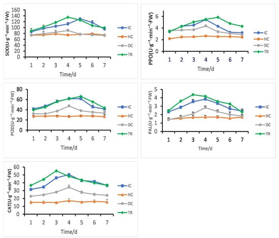 Catalase (CAT) and phenylalanine ammonia-lyase (PAL) activities peaked at day 3, with CAT reaching 55.2 U·g−1·min−1·FW and PAL 4.3 U·g−1·min−1·FW. Peroxidase (POD) and polyphenol oxidase (PPO) also increased, showing maximum activity at day 5 (66.1 U·g−1·min−1·FW for POD, 5.8 U·g−1·min−1·FW for PPO). Superoxide dismutase (SOD) exhibited an early peak at day 4 (135.4 U·g−1·min−1·FW), followed by a gradual decline.