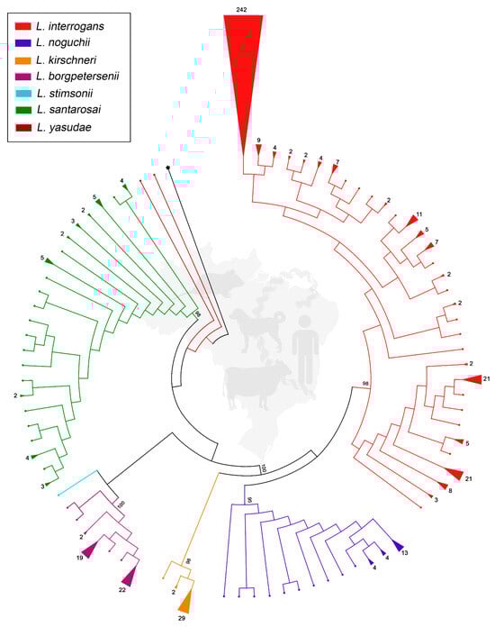 The maximum likelihood phylogeny recovered strongly supported monophyletic clades for each species, with L. interrogans showing the largest number of sequences and broadest distribution across hosts and regions. This dominance underscores the remarkable ecological versatility of L. interrogans, a species capable of maintaining stable transmission cycles in both urban and rural settings, facilitated by its adaptability to a wide range of mammalian hosts [20]. A striking feature was the evidence of clonal expansion, with a single haplotype encompassing 242 sequences, including the reference strain Fiocruz L1-130, detected in humans, domestic animals, and wildlife, and spanning multiple biomes. Such extensive representation across hosts and regions indicates that this clone has achieved ecological dominance, likely supported by its capacity to persist in both maintenance and incidental hosts. The presence of identical sequences in geographically distant areas also suggests recent or ongoing gene flow among populations, possibly mediated by the movement of livestock, companion animals, and synanthropic rodents. The success of this lineage reflects both low genetic variability and wide ecological adaptability, consistent with its role as the major cause of human outbreaks in Brazil, especially in urban centers with high rodent infestation [21]. This evolutionary success likely results from a combination of host plasticity and environmental resilience, allowing the bacteria to survive under fluctuating conditions of humidity, temperature, and salinity. The lineage’s widespread distribution also suggests a long-term evolutionary stability, possibly linked to efficient maintenance within rodent reservoirs and recurrent spillovers to other mammals. The persistence of this haplotype across hosts and landscapes highlights its epidemiological significance: clonal stability may facilitate efficient transmission, while reduced antigenic diversity could simultaneously favor vaccine targeting and amplify risks of large-scale outbreaks if this lineage continues to expand unchecked. From an epidemiological standpoint, this pattern illustrates the dual nature of clonal expansion: it enhances predictability for diagnostic and vaccine development yet increases vulnerability to epidemic resurgence when environmental or climatic conditions become favorable for transmission. Continuous genomic monitoring of this dominant haplotype could therefore serve as an early-warning indicator for urban leptospirosis outbreaks. A clonal subpopulation of L. interrogans was previously reported during leptospirosis outbreaks in Brazil [22]. Similarly, clonal expansion of L. interrogans was identified as the predominant driver of leptospirosis cases in the Indian archipelagos [23]. These findings, observed across independent epidemiological settings, highlight a possible broader global trend in which a few highly adapted L. interrogans lineages sustain the majority of human infections. Such convergence across continents suggests evolutionary optimization toward transmission efficiency rather than diversification. However, further studies employing standardized genetic characterization approaches are needed to confirm this trend and elucidate its evolutionary and epidemiological implications.