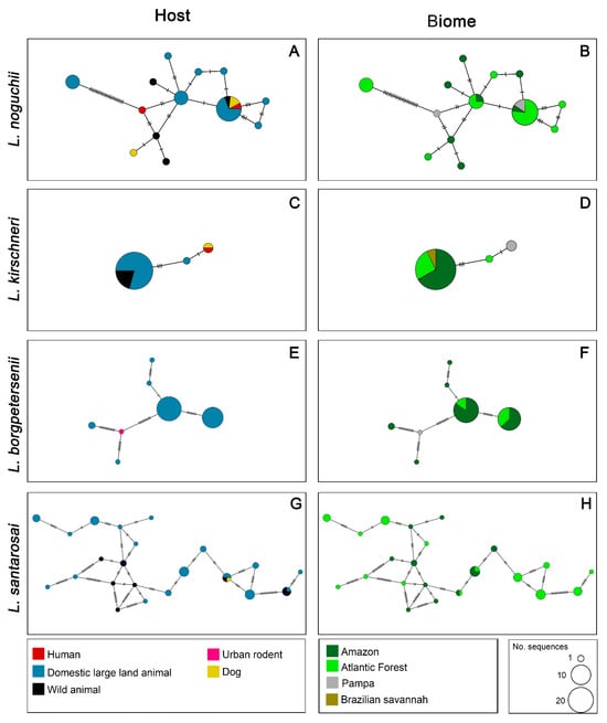 The network for L. santarosai revealed the highest haplotypic diversity among the species analyzed, with numerous haplotypes distributed along a reticulated and complex structure. This network structure was characterized by multiple internal connections, and no single haplotype was dominant. Host distribution showed dominance of domestic large land animals and wild animals, with smaller contributions from dogs (Figure 3G). The biome-based network was similarly diverse, with sequences from only two biomes, the Atlantic Forest and Amazon, with only two shared between regions (Figure 3H).