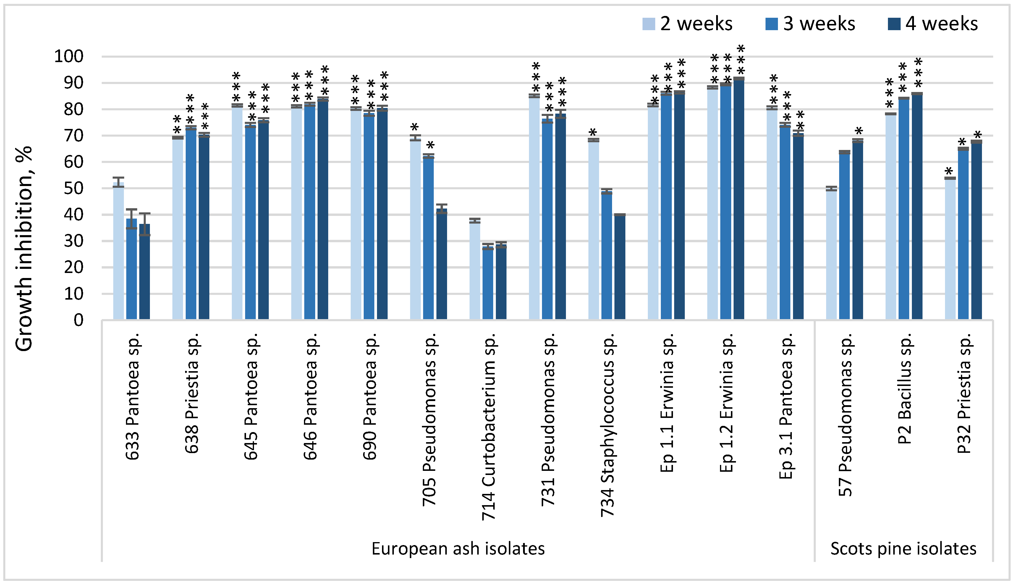 - Vaitiekūnaitė, D.; Striganavičiūtė, G.; Beniušytė, E.; Sirgedaitė-šėžienė, V.; Augustauskaitė, M. Putative Biocontrol Agents for European Forest Pathogens Found in English Oak (Quercus robur L.) Endosphere. Zemdirbyste 2023, 110, 79–86. [Google Scholar] [CrossRef]