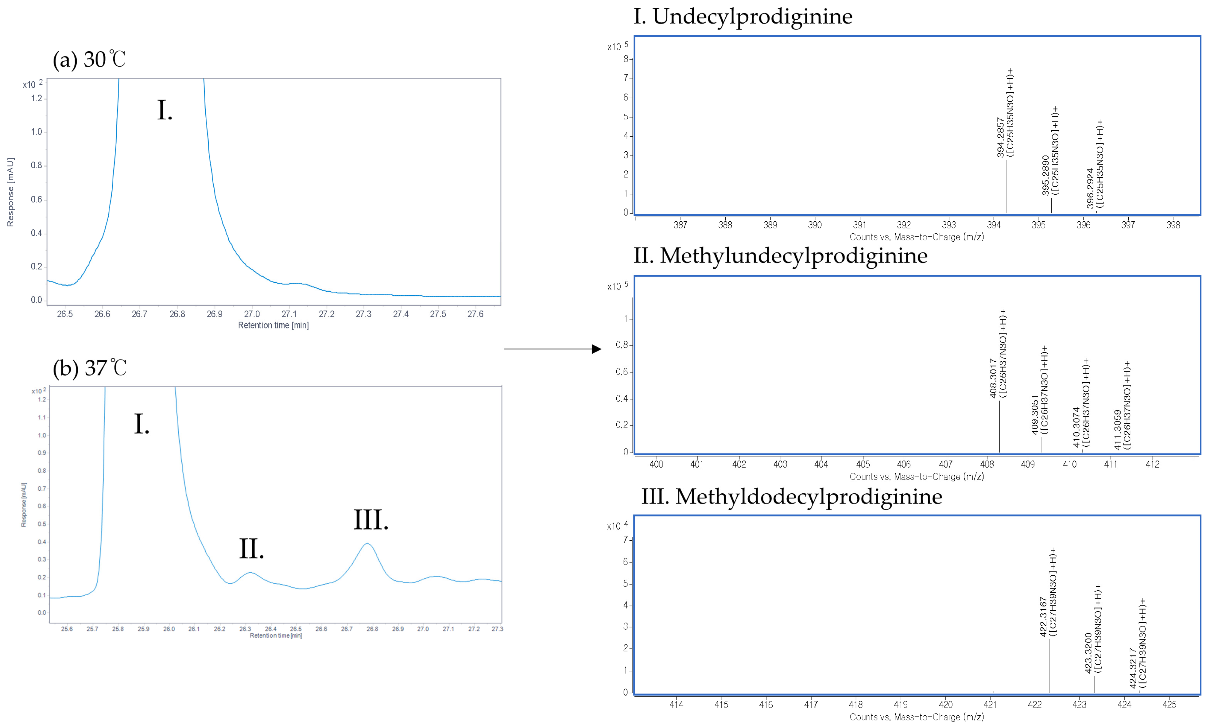 3.1. Heat Stress During the Growth of the M511 Strain Reduces the Production of Undecylprodiginine and Generates Branched-Chain Alkylprodiginines