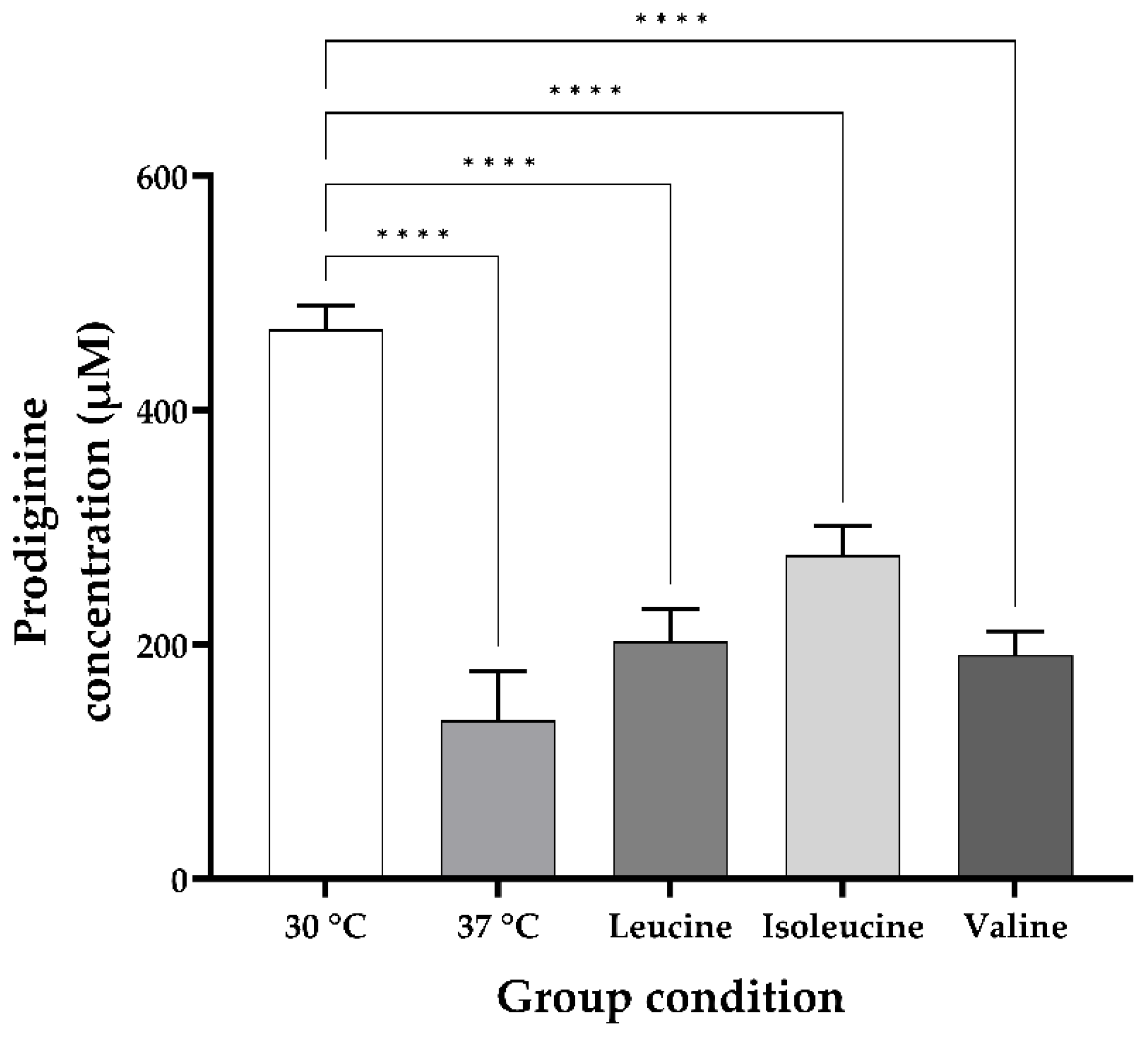 3.2. Changes in the Undecylprodiginine Production Pattern When BCAA Is Added in a Heat Stress Environment