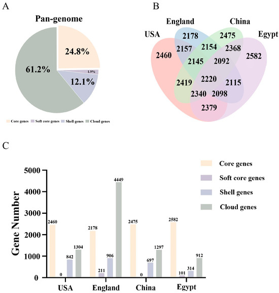 According to the pan-genomic categorization, the gene repertoire of the geographically diverse L. innocua strains was composed of 2,220 core genes (24.8%), 169 soft-core genes (1.9%), 1,078 shell genes (12.1%), and 5,473 cloud genes (61.2%), as detailed in Figure 1A. The pan-genomic composition of L. innocua varies across different regions. Among the L. innocua strains, those the USA harbor 2460 core genes, 0 soft-core genes, 842 accessory genes, and 1304 unique genes. Those from England harbor 2178 core genes, 211 soft-core genes, 906 accessory genes, and 4449 unique genes. Those from China harbor 2475 core genes, 0 soft-core genes, 697 accessory genes, and 1297 unique genes. Those from Egypt harbor 2582 core genes, 101 soft-core genes, 314 accessory genes, and 912 unique genes (Figure 1B,C). Collective analysis of genomic, pan-genomic, and core-genomic features demonstrated that geographically distinct L. innocua strains harbor open genomes. This genomic architecture provides a stable genetic foundation that facilitates their adaptation to diverse and heterogeneous environments.