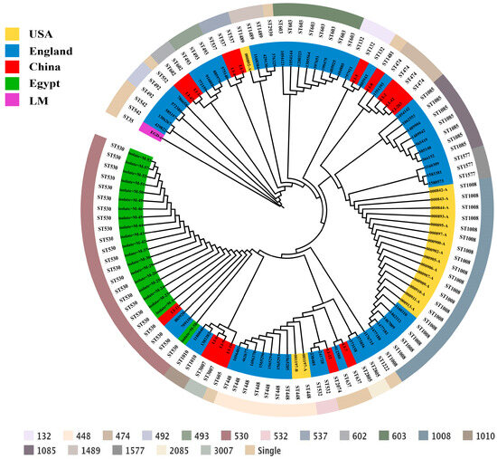 MLST was applied at the whole-genome level to elucidate the genetic relatedness of L. innocua strains from distinct geographical origins, and the phylogenetic relationships were determined among various sequence types (STs). In USA, the most common among L. innocua strains was ST1008 (n = 15, 83.3%) and CC1008 (n = 15, 83.3%) (Table S3). In England, the most common was ST603 (n = 8, 14.5%) and CC600 (n = 8, 14.5%) (Table S3). In China, the most common was ST474 (n = 3, 20%) and CC474 (n = 3, 20%) (Table S3). In Egypt, the most common was ST530 (n = 20, 100%) and CC530 (n = 20, 100%) (Table S3). The MLST predominant types of L. innocua strains isolated from food in different regions vary, indicating that the predominant STs of L. innocua exhibit regional specificity.