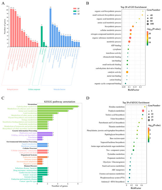 Functional enrichment analysis of core genes in L. innocua from distinct geographic regions. (A) GO enrichment terms. (B) Top 20 significantly enriched GO terms. (C) KEGG pathway enrichment. (D) Top 20 significantly enriched KEGG pathways.