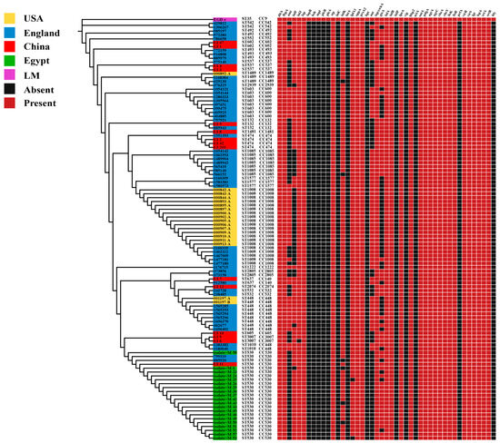 In this study, we retrieved and downloaded all L. innocua strains isolated from food sources from the NCBI Genome Database (last accessed 24 February 2025), comprising a total of 108 whole-genome sequences. This dataset includes 96 L. innocua strains from four different regions (18 strains from the USA, 55 strains from England, 3 strains from China, and 20 strains from Egypt). Additionally, 12 L. innocua strains isolated from food in our laboratory were included, adding to the dataset for the China region. Isolated strains were included based on the following criteria: a genome size between 2.8 and 3.2 Mb, a GC content of 37–38%, ≤20 contigs, and no identical matches in public databases upon comparative analysis. For this study, we retrieved all publicly available genomes of food-derived L. innocua from the NCBI database and combining them with the whole-genome sequences of L. innocua strains isolated from food in our laboratory for subsequent analysis. Comprehensive genomic features of these strains are provided in Tables S1 and S2.