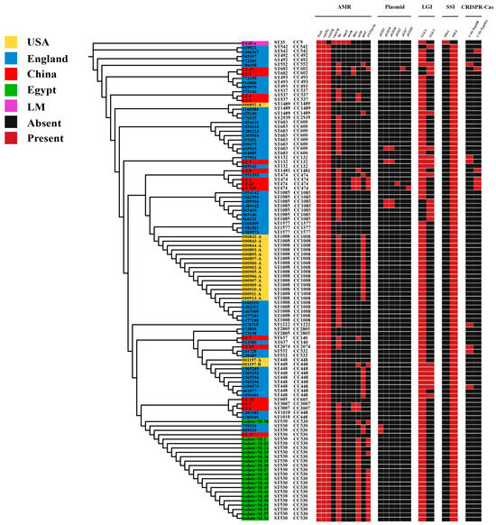 The distribution of antibiotic resistance genes, plasmids, LGI, SSI, and CRISPR-Cas systems in L. innocua from distinct areas.
