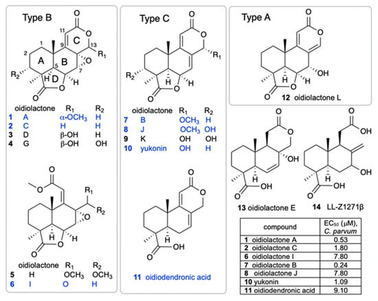 Structures of oidiolactone norditerpenes (1–14) tested against intracellular, nanoluciferase-expressing C. parvum in vitro. Active compounds are indicated in blue, and EC50 (µM) values are shown in the table. The EC50s for inactive compounds (black) were not determined.