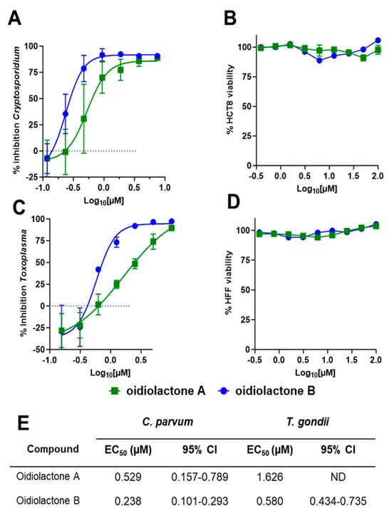 Oidiolactones A and B were tested against HCT-8 infected Cp-NLuc using an expanded range of concentrations to calculate an accurate EC50 (Figure 2A). These select compounds were also tested against fibroblasts infected with the related apicomplexan parasite Toxoplasma gondii (TgRH-Luc:GFP; Figure 2C). The EC50s of oidiolactones A and B against intracellular Cp-NLuc and TgRH-Luc:GFP were in the submicromolar range, with oidiolactone B twice as potent as oidiolactone A against both parasites (Figure 2E). Neither compound showed any toxicity to host cells up to 100 µM when tested under the conditions of the infection assay (Figure 2B,D).