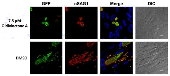 Oidiolactone A inhibits growth of Toxoplasma gondii. TgRH-Luc:GFP infected HFFs were treated with oidiolactone A for 24 h. Cells were then fixed and labeled with anti-SAG1 antibody (red) to visualize the tachyzoite membrane and Hoescht (blue) to label host cell nuclei. Scale bar = 10 µm.