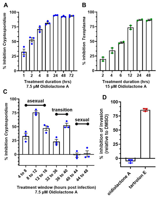 While T. gondii tachyzoite cultures, used here to determine anti-Toxoplasma activity, are representative of just the one life cycle stage, C. parvum in vitro cultures develop through three rounds of asexual replication during the first ~32 h, at which time they begin to transition to formation of the male and female gametes [4]. By 44 h post-infection, the culture consists of primarily gametes. In standard 2D cultures, the life cycle halts at fertilization and no oocysts are produced. However, the accurate timing of asexual and sexual development in HCT-8 cells has been reported [4], and this timeline can be used to evaluate the susceptibility of different parasite stages to anti-parasitic compounds [4,45]. Oidiolactone A (7.5 μM) was added to HCT-8 cells for 4 h intervals post-infection with NLuc-C. parvum oocysts. Inhibition (20–75%) was observed only for parasites in the asexual stage of proliferation, and during transition to sexual stages (Figure 5C). Oidiolactone A exhibited no activity against gamete stages.